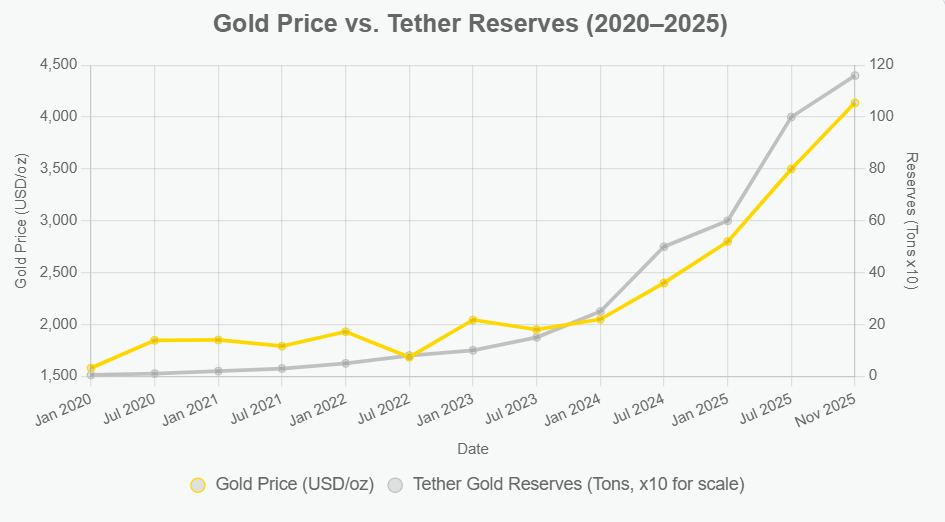 To visualize this alignment, consider the following chart of average monthly gold prices (USD per ounce) from January 2020 to November 2025, overlaid with key Tether gold reserve milestones (in tons, scaled for comparison).