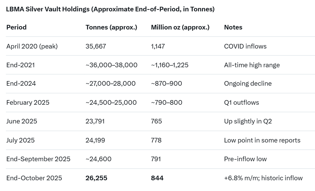COVID-era peak (2020–2021): Holdings surged to record highs, reaching ~35,000–38,000 tonnes (around 1.1–1.2 billion oz) due to massive physical deliveries into London amid market disruptions and ETF inflows. – although the LBMA was accused during this period of misrepresenting silver inventories (intentionally fudging the numbers by 3,300 metric tonnes), with reports in May 2021 claiming the LBMA had 3,300 tonnes more silver than it actually held in London vaults. These claims are based on concerns that LBMA figures include silver that is not available for physical delivery, such as that held by ETFs, and fail to reflect the “free float” of silver. 2022–2024 decline: A multi-year downtrend began as silver flowed out to meet rising industrial demand (especially solar/electronics), ETF outflows in some periods, and arbitrage to higher-premium markets. By mid-2025, stocks had fallen ~50% from the 2020 peak. 2025 developments: (tightness followed by replenishment- if the official LBMA reports are not still being intentionally doctored): Early 2025: Continued draws, with significant outflows in Q1 (e.g., ~4,000 tonnes withdrawn Dec 2024–Feb 2025). Mid-2025 (summer): Stocks hit multi-year lows around 23,000–24,000 tonnes amid strong industrial/ETF demand and structural global deficits.  July 2025: ~24,200 tonnes. Late summer/autumn 2025: Extreme tightness (“silver squeeze”) drove lease rates to record highs, with “free-float” (immediately available) silver critically low (~155 million oz or less in Sept/Oct). Silver lease rates exceeded an astonishing 40% during this period, signifying the extent of the physical shortage in the global market.Longer-term, LBMA silver stocks are still well below COVID peaks but have stabilized/recovered from 2025 lows according to the official LBMA data. Rumors persist throughout the market that the LBMA has not yet delivered ANY silver to India that was purchased in October – which could explain how the LBMA’s silver inventory numbers supposedly jumped in October despite a global silver supply squeeze which saw lease rates in excess of 40%. For now, the LBMA survives on COMEX & Shanghai withdrawals, but China has clamped down on this with silver export restrictions that go into effect January 2026.