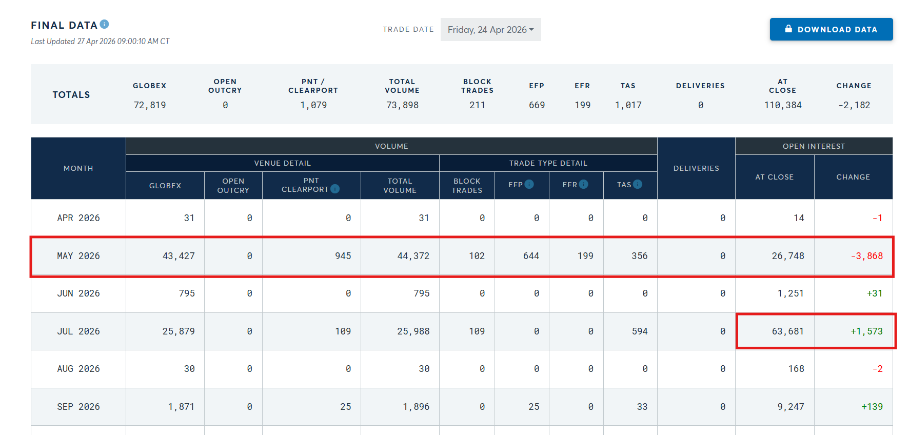 July – which will become the front month for silver later this week- increased by 1,573 to 63,681 contracts.