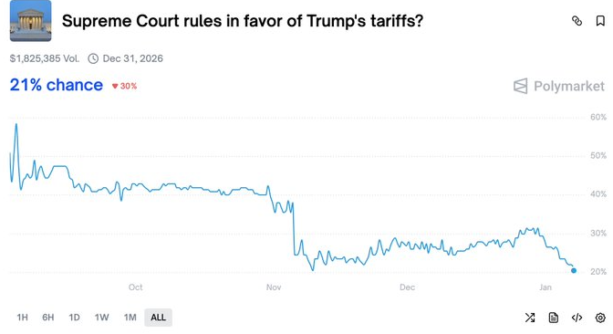 The market expects SCOTUS to rule against Trump, with Polymarket odds currently showing a 79% chance that Trump’s Tariffs will be struck down: