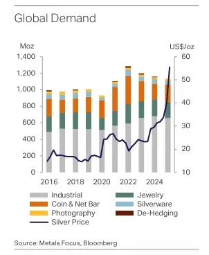 The market has now recorded six consecutive annual deficits, with shortages continuing to draw down above-ground inventories. While total supply rose in 2025, driven by modest increases in mining and recycling, these gains have not been enough to close the gap. Much of the world’s silver is produced as a byproduct of other metals, limiting how quickly output can respond to higher prices.