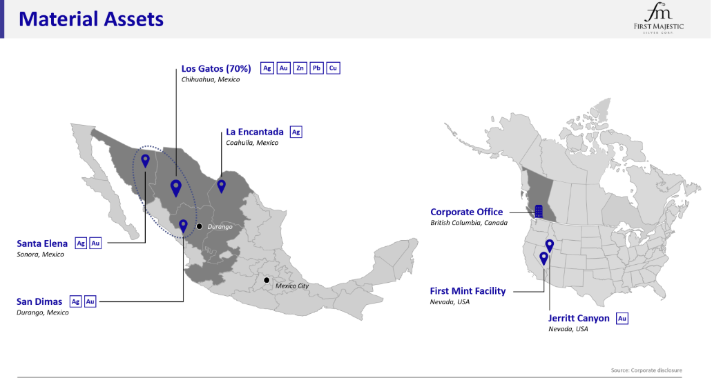 First Majestic is a publicly traded mining company focused on silver and gold production in Mexico and the United States. The Company presently owns and operates four producing underground mines in Mexico: the Santa Elena Silver/Gold Mine, the Los Gatos Silver Mine (the Company holds a 70% interest in the Los Gatos Joint Venture that owns and operates the mine), the San Dimas Silver/Gold Mine, and the La Encantada Silver Mine, as well as a portfolio of development and exploration assets, including the Jerritt Canyon Gold Mine located in northeastern Nevada, U.S.A.