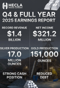 Hecla Mining Company (NYSE: HL) released its Q4 and full-year 2025 earnings results today, marking a standout year for the leading U.S. silver producer.