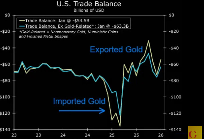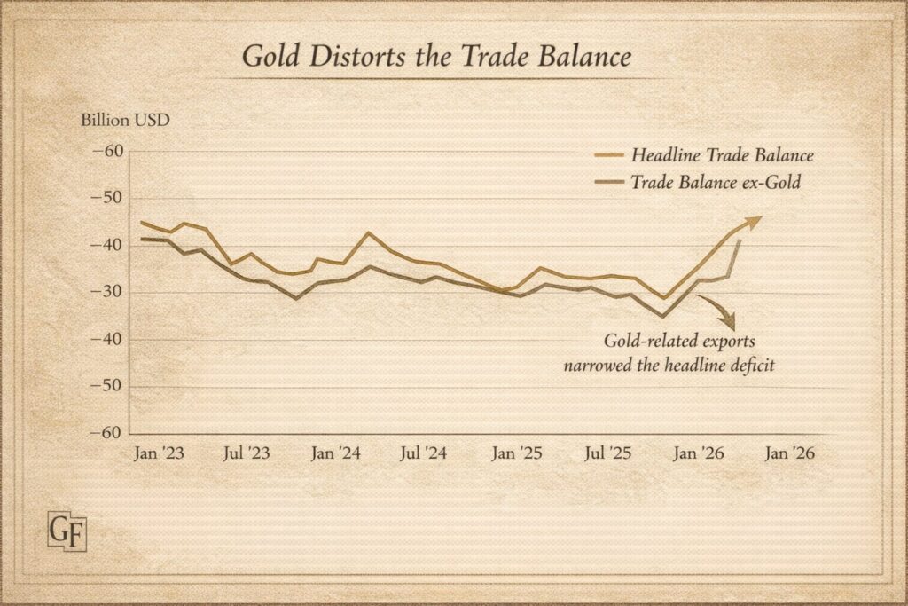 In January, the reported narrowing of the trade deficit overstated the underlying improvement once gold-related categories were removed from the calculation. In other words, part of the apparent adjustment in the trade balance reflects the movement of investment metals rather than changes in the real production economy.