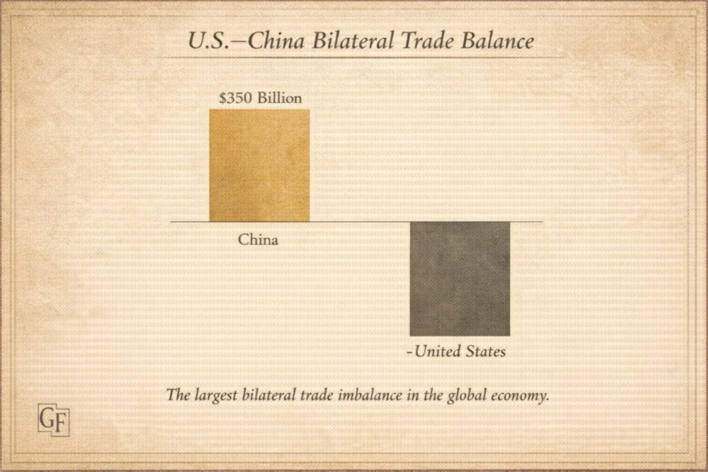 Those conversations are occurring against a structural backdrop that has remained unchanged for decades. The United States runs a persistent trade deficit, while China runs a persistent surplus. Historically, the imbalance has been settled through the dollar system. The United States imports goods and exports financial claims. Surplus economies recycle their earnings into dollar assets.
