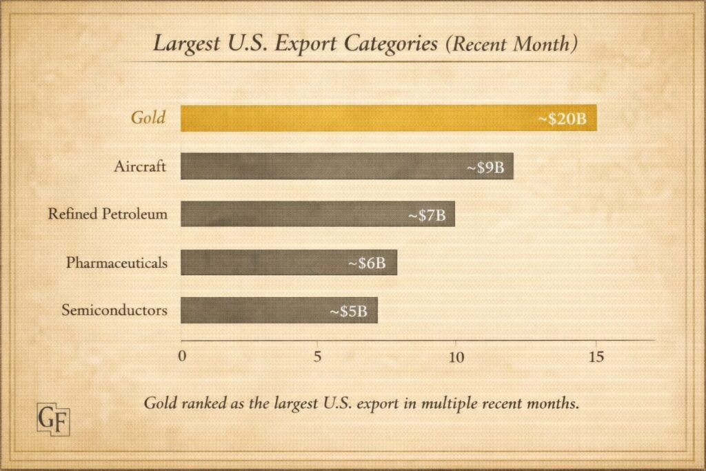 In three of the past four months, gold has ranked as the largest U.S. export category. Luke Gromen recently highlighted that statistic, noting that a similar pattern has not appeared in at least two decades of data.