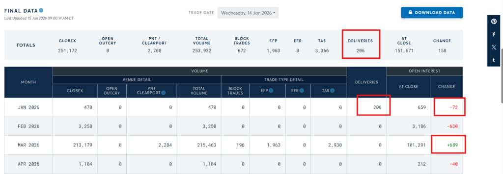 🔥206 Deliveries Were Reported in the Jan Silver Contract Wednesday, Yet January Silver Open Interest Only Declined by 72 Contracts, Suggesting Another 134 Contracts Rolled Backwards from March to Jan for Silver Delivery.