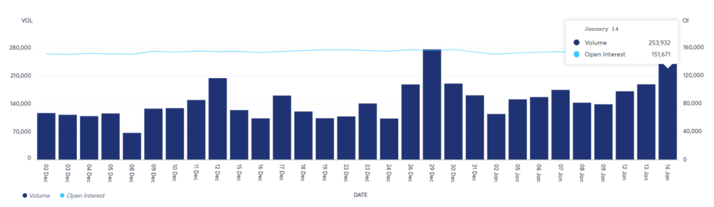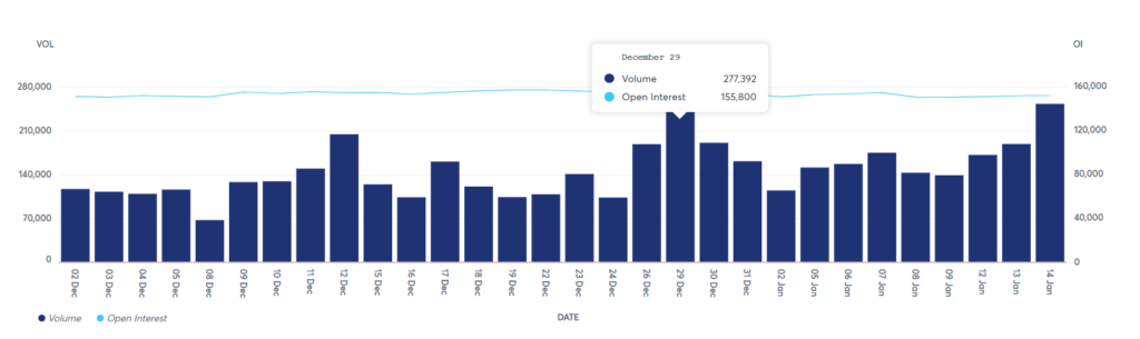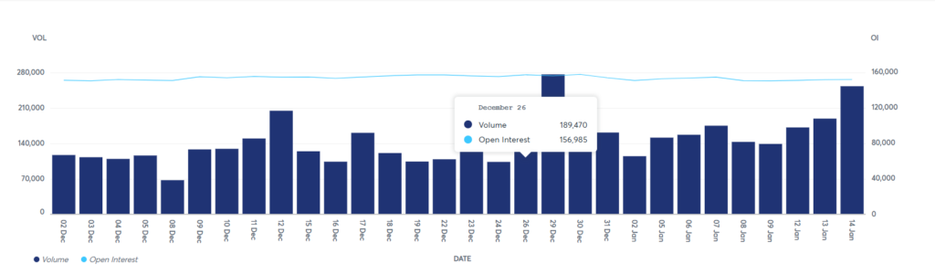 Open Interest that preceding Friday 12/26 was 156,985 contracts, with total volume of 189,470.
