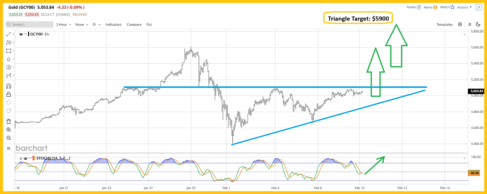 The glorious ascending triangle action suggests that it’s still a great time to buy and the triangle target is about $5900.